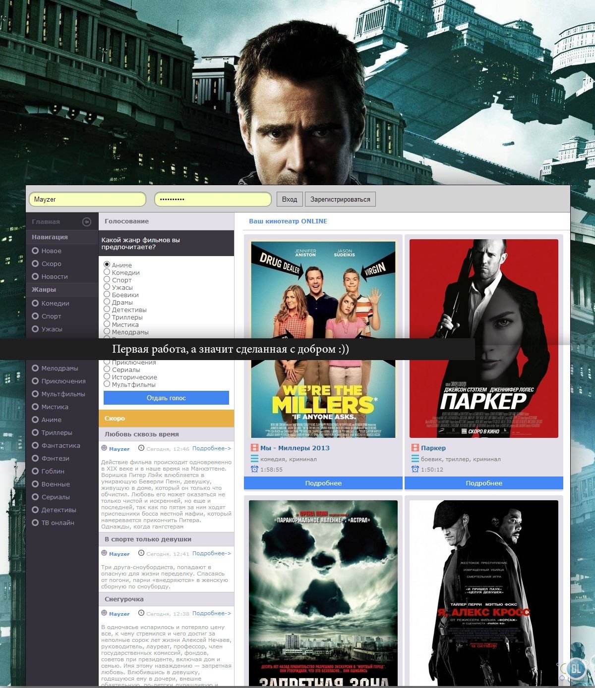Обратите внимание на простой и очень удобный шаблон на тему Кино, в шаблон присутствуют только нужное для киномана, нечем не перегружен, приятный цвет шаблона, возможность менять задний фон под любой фильм.
