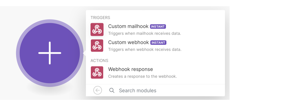 4. Давим на плюс и избираем webhooks -> Custom webhook. Этот модуль нужен для получения уведомлений от банка.