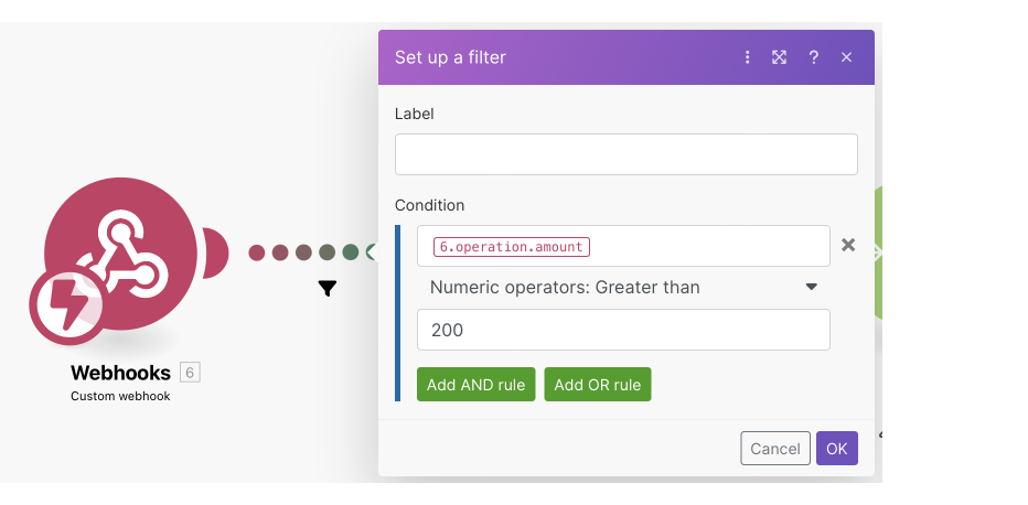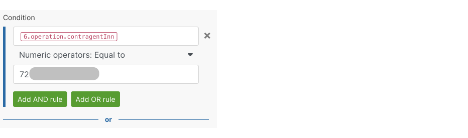 3. Сейчас настраиваем 1-ый фильтр: ИНН (параметр {{6.operation.contragentInn}}) равен (numeric equal to) 720000000.