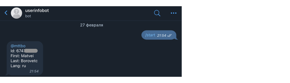 - Для этого необходимо выяснить Chat id каждого из менеджеров. Просто попросите их написать боту t.me/userinfobot и сказать вам код из 6 цифр.