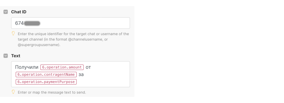 - В текстовое поле набираем месседж, который вы бы желали получать. К образцу: Получили {{6.operation.amount}} от {{6.operation.contragentName}} за {{6.operation.paymentPurpose}}. Ах так это смотрится: