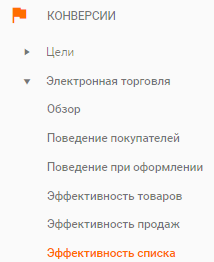 Рис. 15. Меню отчетов в электронной торговле в Google Analytics