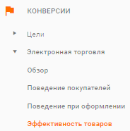 Рис. 18. Меню отчетов электронной торговли в Google Analytics