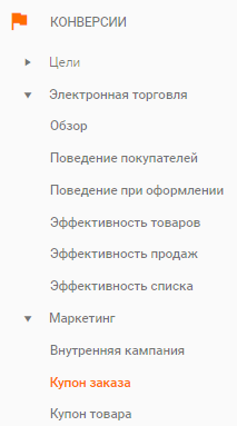Для рекламщиков важными отчетами станут отчеты по скидочным купонам. Они находится общо с иными отчетами по Электронной торговле по пути Конверсии?Электронная торговля?Маркетинг?Купон Заказа(Купон продукта).
