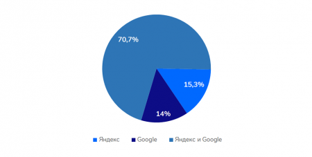 Доля Яндекса только немножко выше – 15,3% против 14% у Google. В главном же сайты продвигают сразу под два поисковика – так делают 70,7% опрошенных.