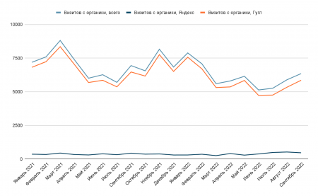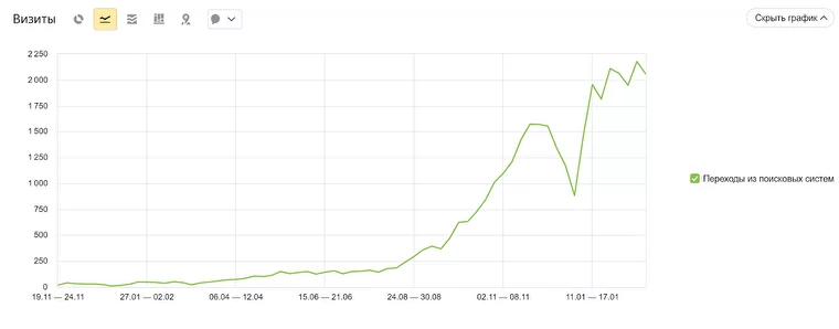 Визиты по органике выросли в 7 разов за 5 месяцев. Когда мы лишь выдумали концепцию, на моем сайте было 150-160 визитов в недельку.