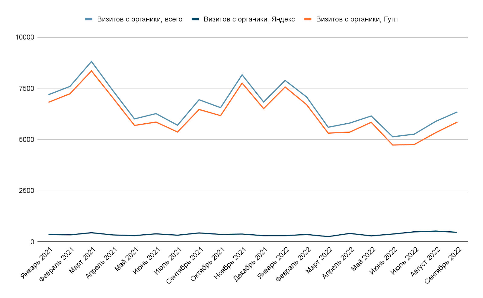 Поначалу мы приуныли. Казалось, работа, проделанная ранее, больше не будет приносить этот же итог. Но невзирая на мощное падение всех других отраслей, теснее осенью 2022 года поисковый трафик начал восстанавливаться, и вышел на уровень 2021 года. К январю 2023 года поисковый трафик резко вырос. Кажется, сработал отложенный спрос.