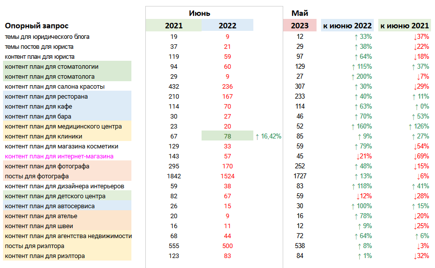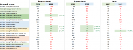 Равномерно жизнь бизнесменов и SMM-специалистов (которые не переориентировались на западные рынки) возвратилась в обыкновенное русло, они опять стали отыскивать контент-планы в Яндексе и русскоязычном Google. И на данный момент по неким тематикам запросы даже выше, чем два года назад.