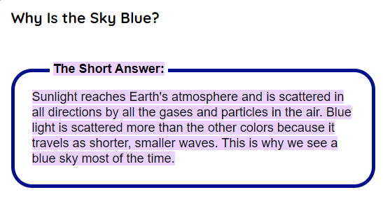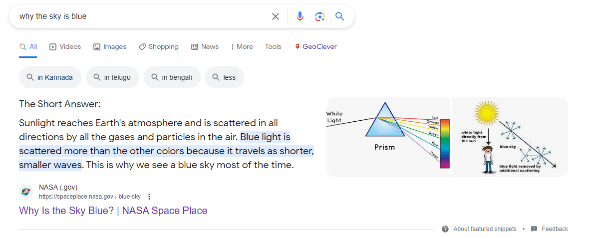 Для сопоставления мы задали тот же вопросец Google. Он дает нам «featured snippet» с выделенным предложением с сайта NASA Space Place:
