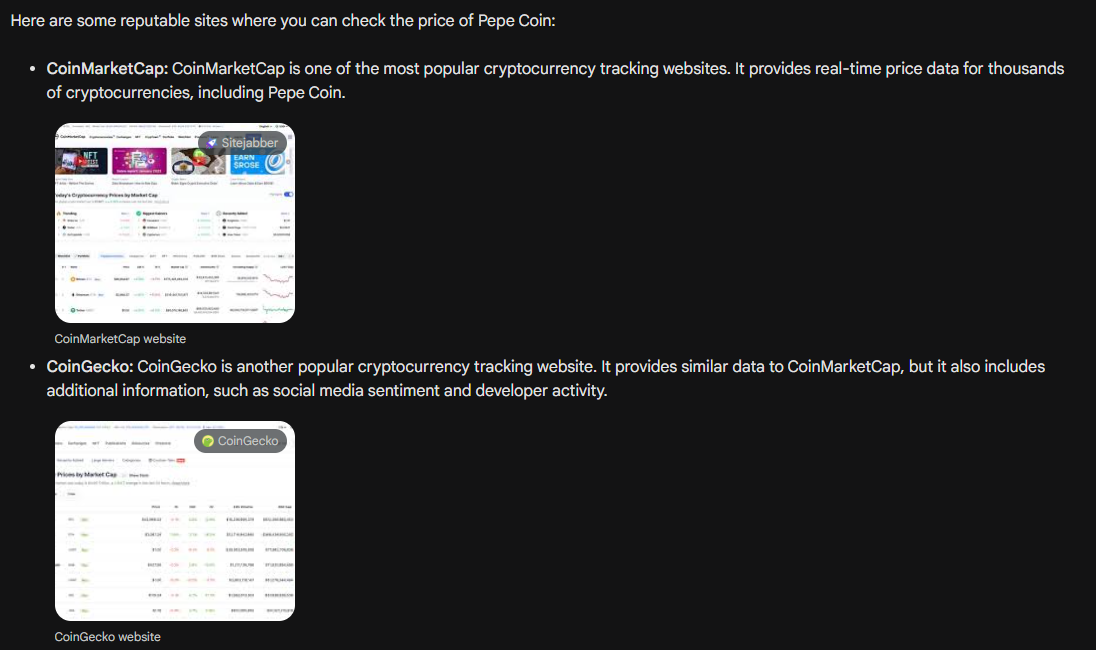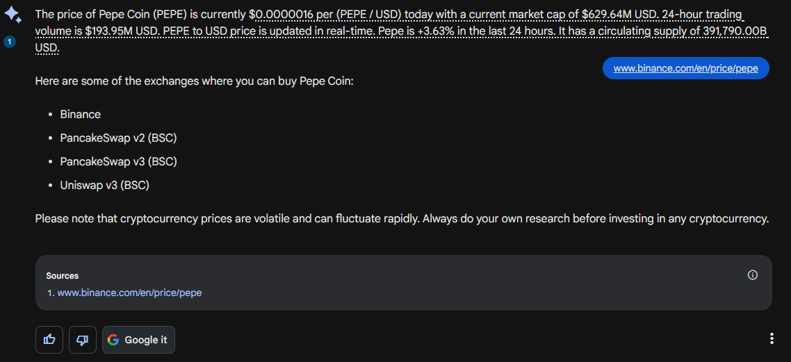 Также мы узрели, что в ответе Bard указано, где можнож приобрести монету Pepe. Эта информация содержится на страничке CoinMarketCap, но отсутствует на Binance.