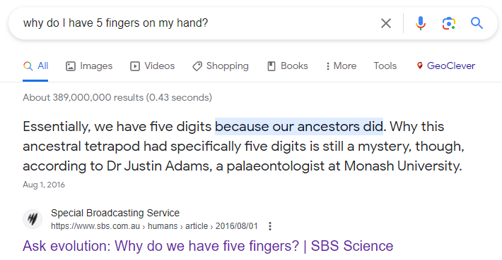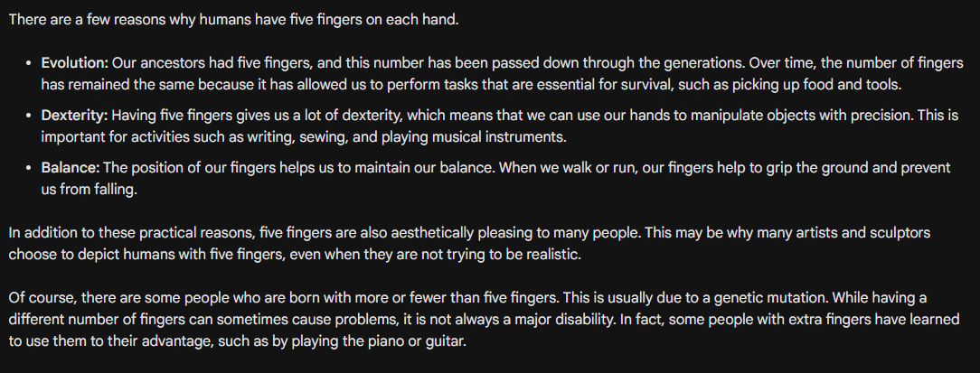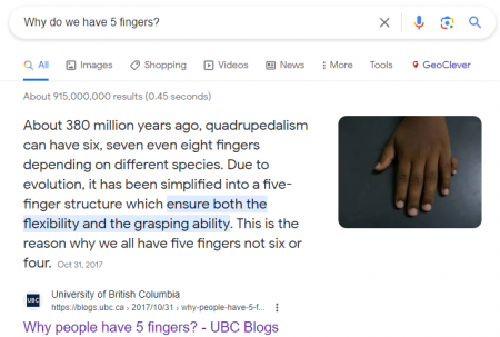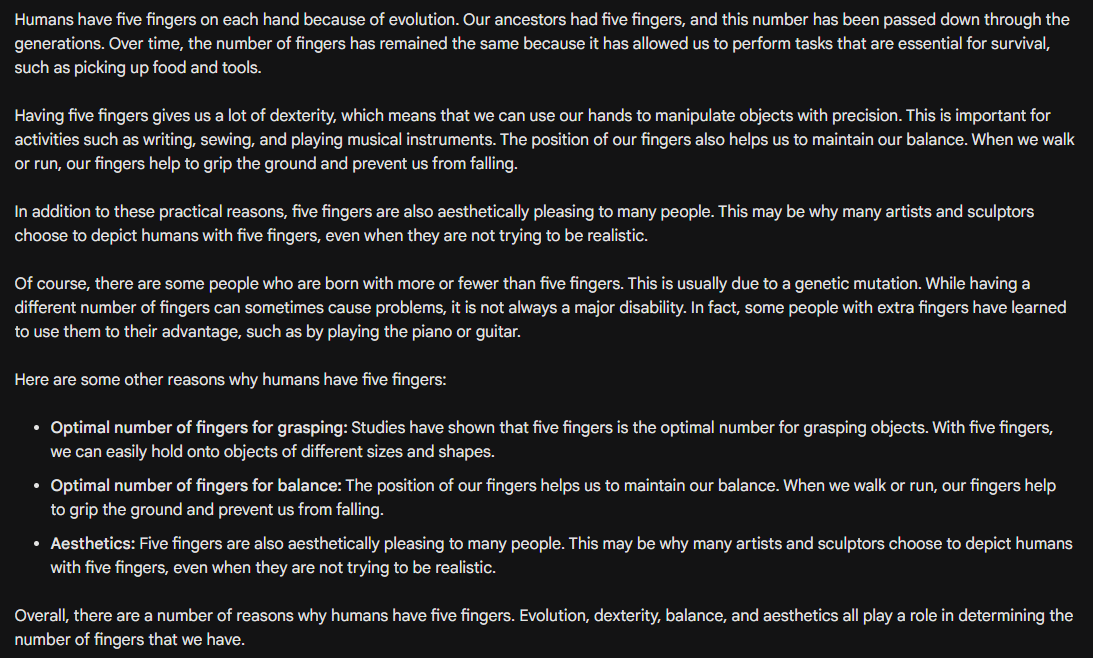 Анализ веса и частоты потребления слов в ответе Bard, контенте на страничке по запросу «Why do we have 5 fingers?» и «featured snippet» не показал никаких связей.