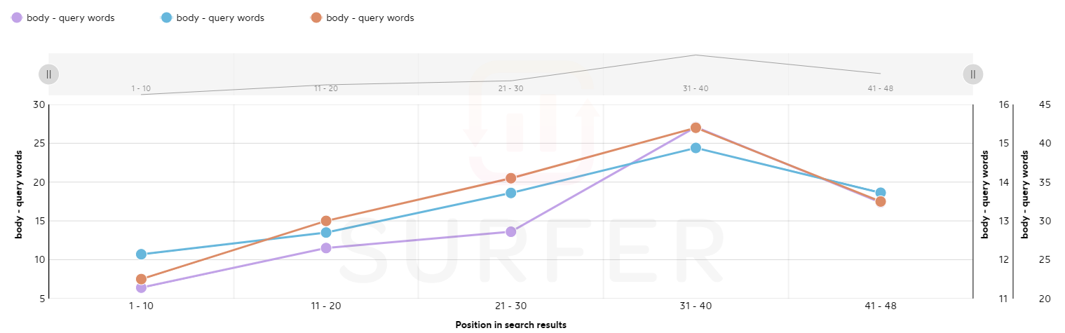 Сервис показал прямую связь с внедрением слов «do», «have», «why» в доли body. Эти слова почаще употребляются на сайтах из топ-10, от 89 до 75 разов. На сайтах со 2-ой и последующих страничек выдачи эти слова встречаются 65-55 разов.