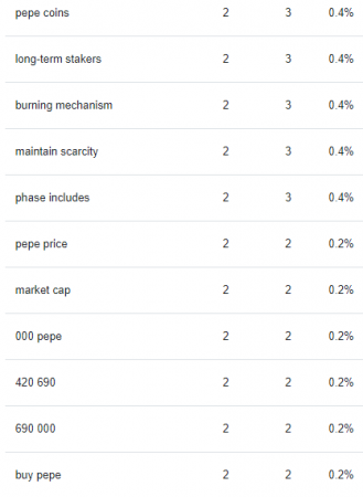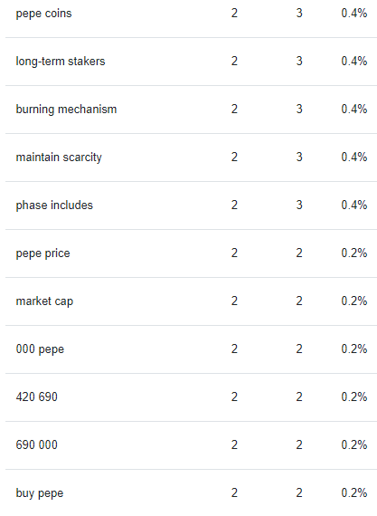Результаты текстового анализа контента со странички CoinMarketCap различаются от Binance и Bard. Главной запрос «Pepe price» упоминается три раза, а процент вхождения сочиняет 0,2% против 0,9% у Binance и 1% у Bard: