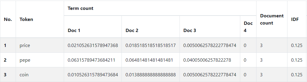Bard (doc 1) и Binance (doc 2) имеют недалёкие характеристики Term Count. Их характеристики TFxIDF для слов «price» и «Pepe» тоже чрезвычайно недалеки. Но CoinMarketCap (doc 3) имеет схожие с Bard результаты по вхождению слова «Coin».