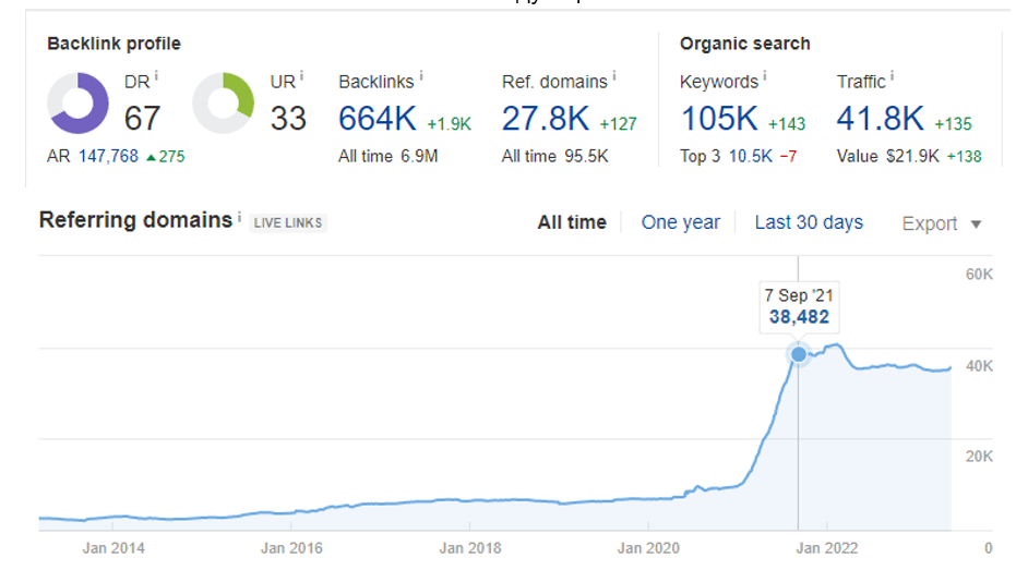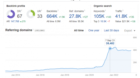 В качестве подопытного мы избрали сайт Thefashionisto. Почему?Этот сайт достаточно живо набрал ссылочную массу и сильно прирастил собственный DR с декабря 2020 года по август 2021 года.