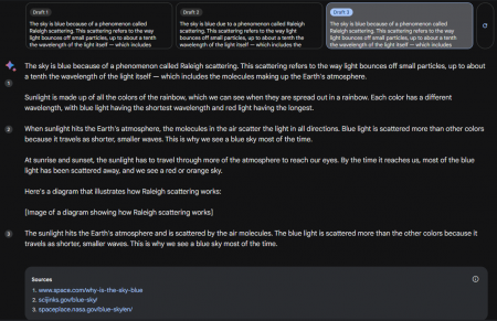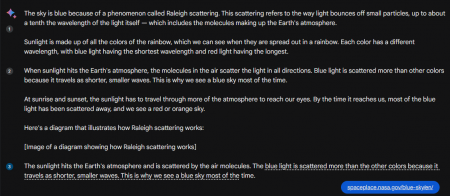 Ответ Google на вопросец «Почему небо голубое?» и то, что сгенерировал Bard, различаются друг от друга. Желая Bard, как и Google, употреблял информацию с сайта NASA Space Place для генерации третьего драфта:
