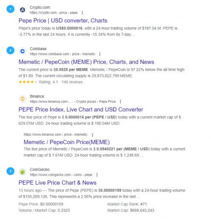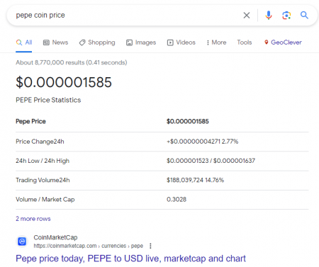Тот же сайт получил «featured snippet» от Google при запросе «Pepe coin price»: