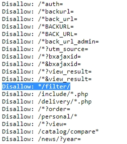 Мы нашли в Яндекс Вебмастере и Google Search Console, что странички фильтрации в каталоге не индексировались обеими поисковыми системами. Оказалось, что все эти странички были закрыты от индексации в директиве Disallow.