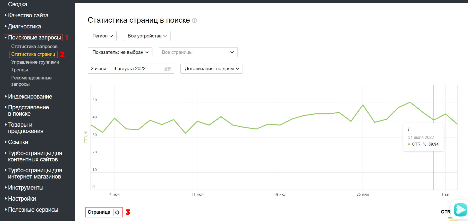 Проверить CTR страничек можнож в Яндекс Вебмастере. Для этого заходим в «Поисковые запросы» -> «Статистика страниц». При нажатии внизу клавиши «Страница» избираем показатель «CTR, %».