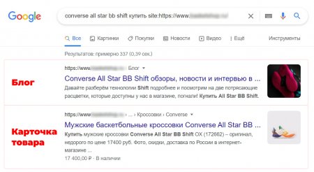 На проекте по продвижению интернет-магазина по продаже спортивной обуви при запросе конкретной модели первую позицию в выдаче занимал блог, а теснее позже карточка продукта.