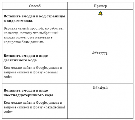 И Яндекс, и Google поддерживают все методы внедрения эмодзи. В случае с кодовым написанием поисковики сами преобразуют код в знак для собственных сниппетов.