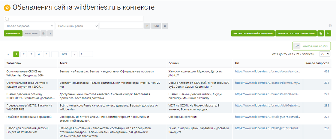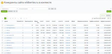 В перечне избираем основных конкурентов с величайшим количеством общих ключей в объявлениях. К примеру, market.yandex.ru имеет 35 061 общих ключей с wildberries.ru, а sbermegamarket.ru 3115 ключей.