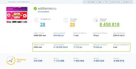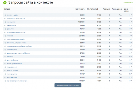 В отчете «Запросы сайта в контексте» собраны запросы, по которым встретились объявления анализируемого сайта. По сиим запросам сайт получает трафик из контекстной рекламы.