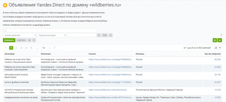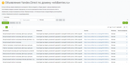 Чтоб начать работу, введите домен или ключевую фразу. В отчете вы увидите заглавия, описания и ссылки объявлений, регионы показов, запросы, по которым запущены объявления. Можнож выяснить, какие местоположения исключил ваш соперник.