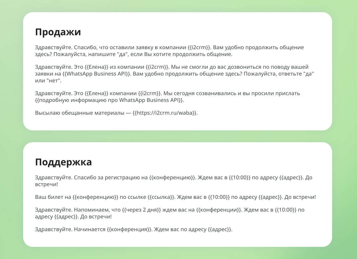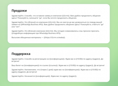 Все шаблоны требуют согласования с Facebook*. С сиим также могут посодействовать партнеры, к примеру в i2crm. Они предоставляют компаниям список теснее согласованных с WhatsApp шаблонов либо посодействуют создать личные.