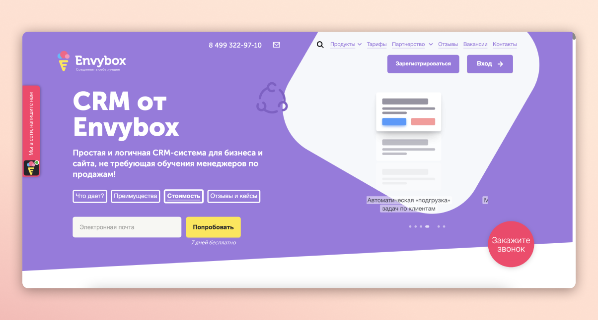 Envybox не разговаривает о том, что CRM-система самая лучшая на базаре. Через УТП бренд ведает, чем полезен клиентам, которые планируют получать CRM-систему.