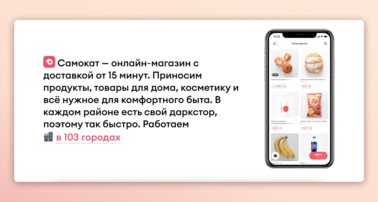 Сервис доставки продуктов кормления и продуктов для дома. Бренд избирают за скорость доставки – от 15 до 30 минут. Ежели курьер задерживается, клиенту дают компенсацию. В УТП бренд разговаривает, почему сервис доставляет прытче соперников – пункты Самоката представлены в каждом районе городка.
