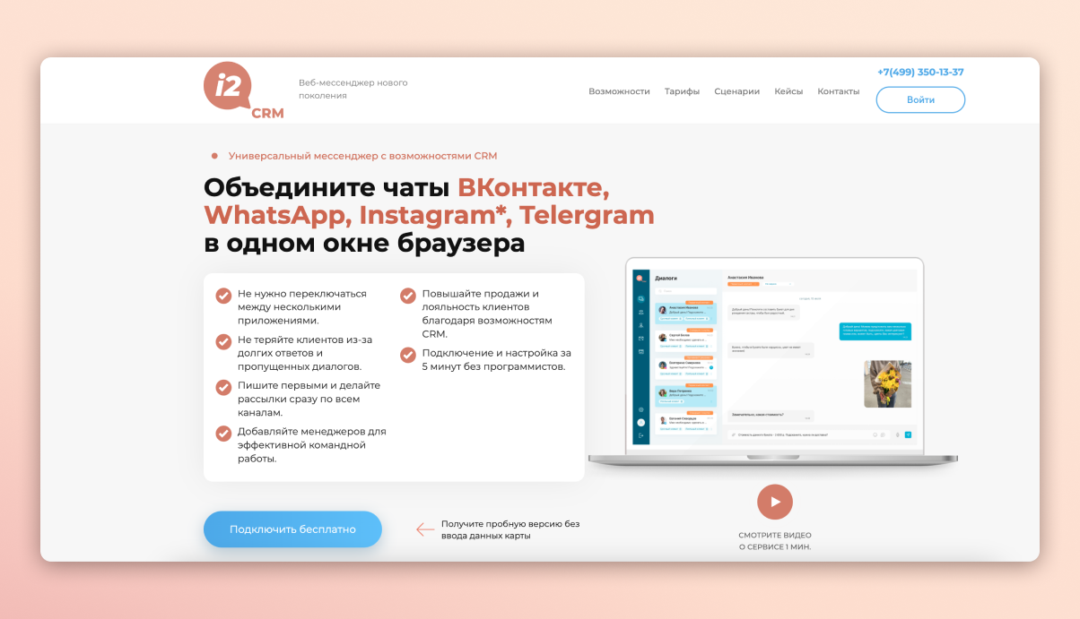В УТП компании с первого предложения понятно, для чего же сотворен IT-продукт – чтоб объединить в одном рабочем пространстве известия из соцсетей и мессенджеров. Бренд ведает клиентам о превосходствах Веб-мессенджера через сценарии применения.
