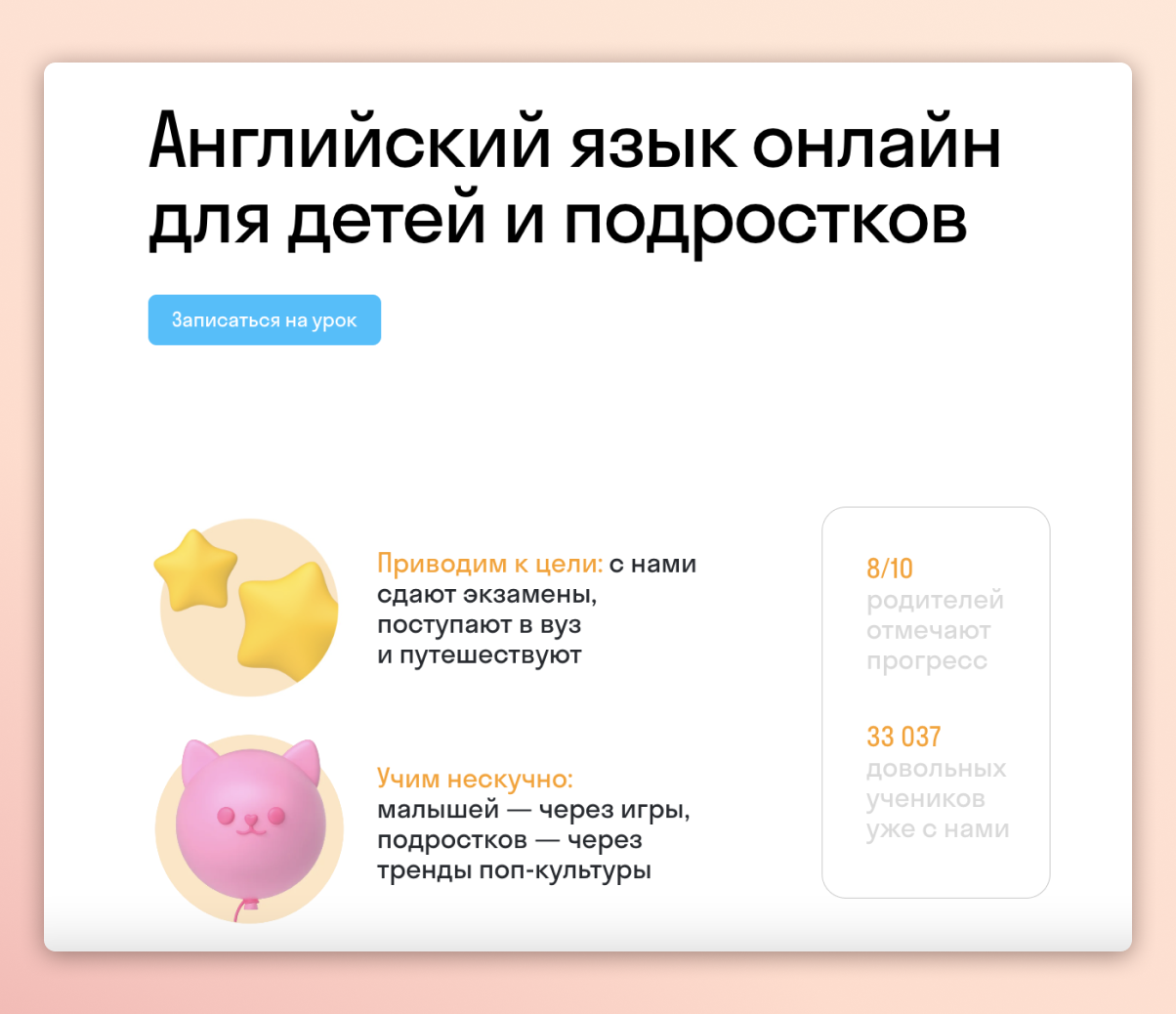Онлайн-сервис по исследованию британского языка. Школа работает лишь с детьми и детками, но потенциальные клиенты – предки, и УТП ориентировано на взрослых. На сайте написано, что получат детки, ежели будут заниматься в Skysmart – нескучный подход к обучению и конкретный итог.