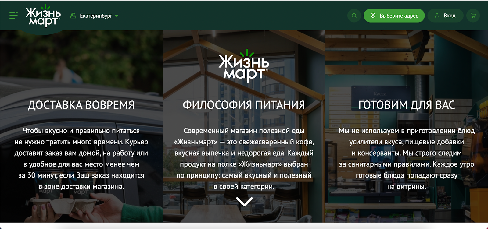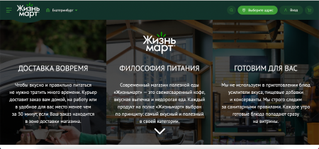 Круглосуточный магазин продуктов и готовой пищи с безвозмездной доставкой за 20 минут. На основной страничке сайта три понятных и обычных УТП. Они демонстрируют покупателю, что он получит, когда сделает заказ в Жизньмарт: дешевый ассортимент, полезную продукцию и прыткую доставку.