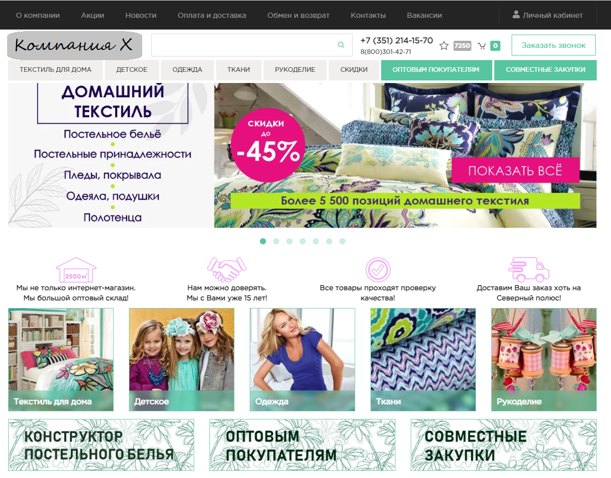 Пример настоящего сайта по продаже текстиля. Чрезвычайно много зрительного гула, ясных картинок, посреди которых потерялись УТП компании и главная часть шапки: темная строчка не воспринимается глазом