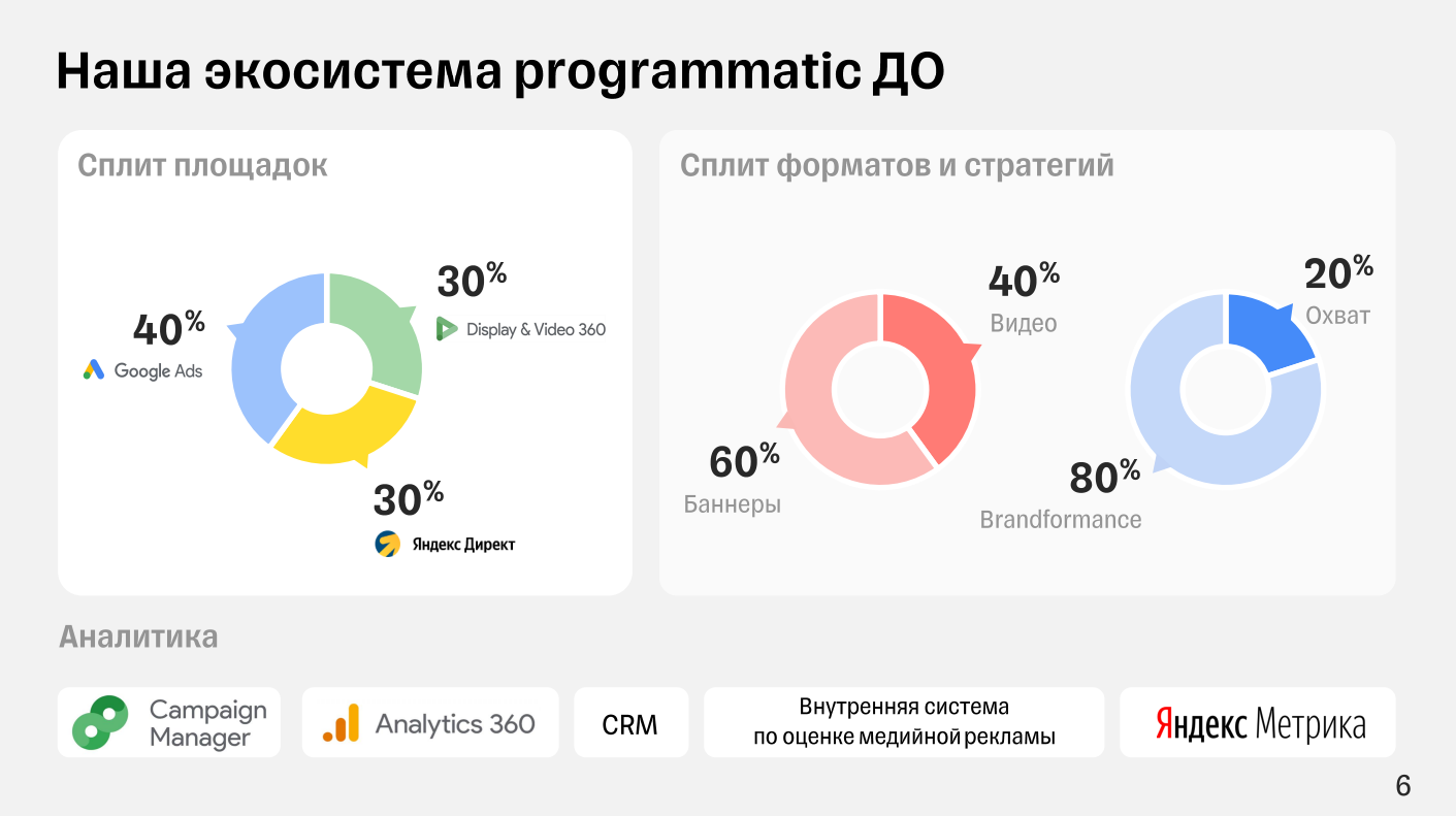 Около 80% бюджета мы выделяли на brandformance-кампании, где мы глядели post-view конверсии. Оставшиеся 20% шли на охват. Из всех форматов 60% приходилось на баннеры за счет их высочайшей эффективности и 40% – на видео. Вся аналитика строилась на Campaign Manager, потому что этот инструмент дозволяет расценивать конкретно post-view конверсии медийных маркетинговых кампаний. Кроме этого, употребляли Google Analytics, CRM, внутреннюю систему по оценке медийной рекламы. В редких вариантах обращались к «Яндекс Метрике».