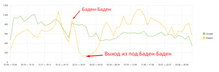 У 1-го нашего клиента сначала 2018 года сайт попал под фильтр Яндекса «Баден-Баден» из-за того, что около 50% страничек сайта – страницы-каннибалы с контентом гадкого свойства. Прошлые оптимизаторы попытались, «насеошили» и загнали сайт под фильтр. Так и началось наше плодотворное сотрудничество, которое продолжается и по этот день.