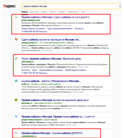 На образце ТОП-10 страничек в выдаче Яндекс – 3 узконишевые под прием кабельного лома