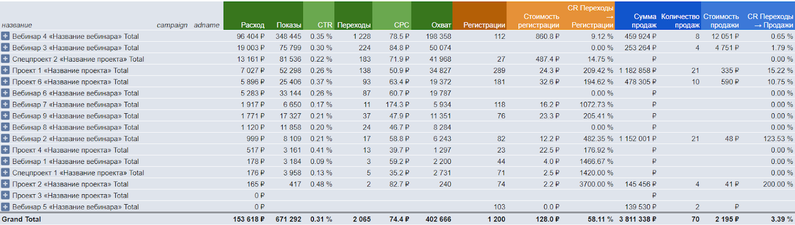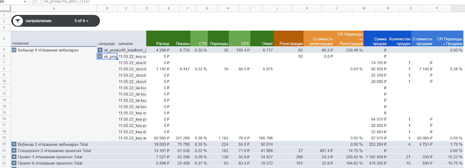 На выходе получаем табличку, в которую прибавляем нужные нам строчки и значения. Я вывел в строчки наименования запусков и кампании с объявлениями, а в значения – всю воронку от статистики ВКонтакте до целей Метрики и продаж из CRM.