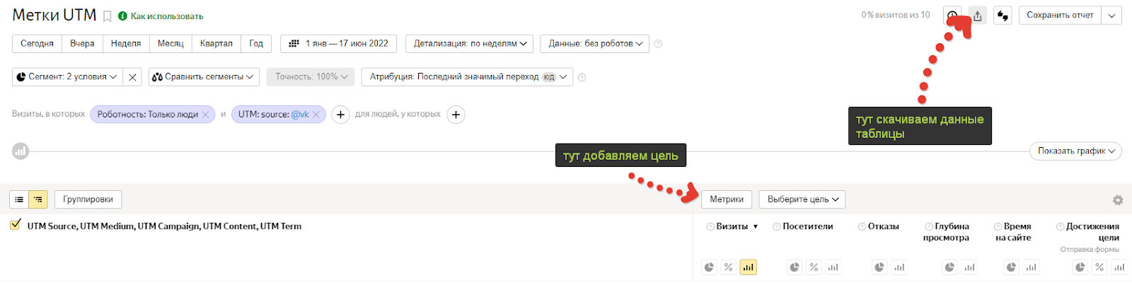 Сейчас достаем данные из Метрики. Для этого идем в отчет «метки UTM», прибавляем нужные цели для анализа и выгружаем все в табличку Excel.