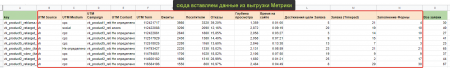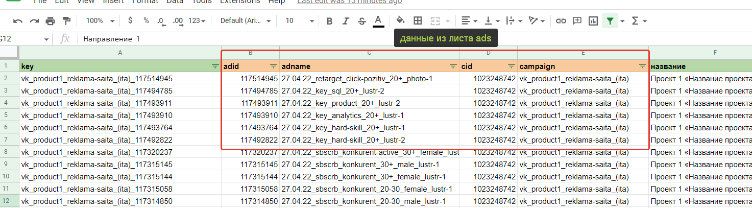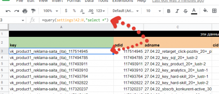 На листе вы сможете увидеть доп столбцы зеленоватого цвета. На «date» сможете не заострять внимания, это я тестировал свои варианты. А вот «key» критически главен, там формула склеивает заглавие кампании с id объявления – это критически главно, потому что с поддержкою ключа в последующем мы склеим различные источники данных.