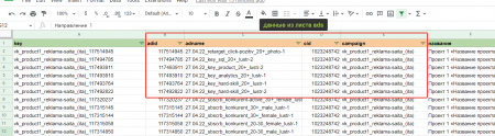 Кстати, Альбато – не панацея. Ежели вы не желаете применять его, то подобную конструкцию можнож смонтировать наиболее длинноватым методом, поначалу выгрузив из статистики рекламы ВКонтакте данные по объявлениям и позже обогатив их наименованиями кампаний и id кампаний в доп столбцах.
