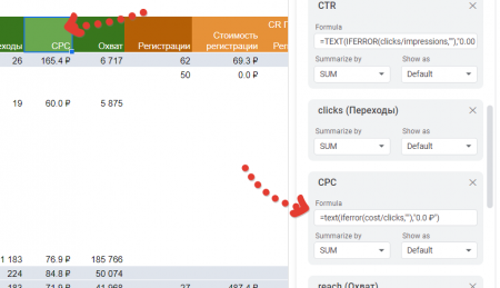 В данном образце у нас три KPI цели: регистрации на вебинар, отправки форм, регистрации Timepad. Для их прибавляем зеленоватый столбец, где суммируем все KPI значения для удобства.