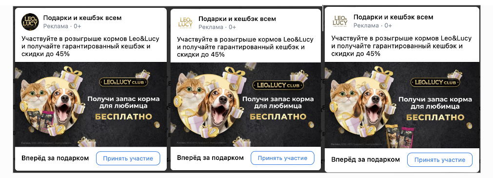 Для продвижения разработали несколько креативов. Во всех объявлениях употребляли различные изображения и логотипы бренда, но однообразный текст: упор делали на способности получить скидку, кешбек и иные гарантированные подарки. Формат «Всепригодные объявления», работающий в VK Рекламе по умолчанию, автоматом сгенерировал из загруженных креативов различные маркетинговые форматы и адаптировал их для показа в лентах ВКонтакте и в ОК.