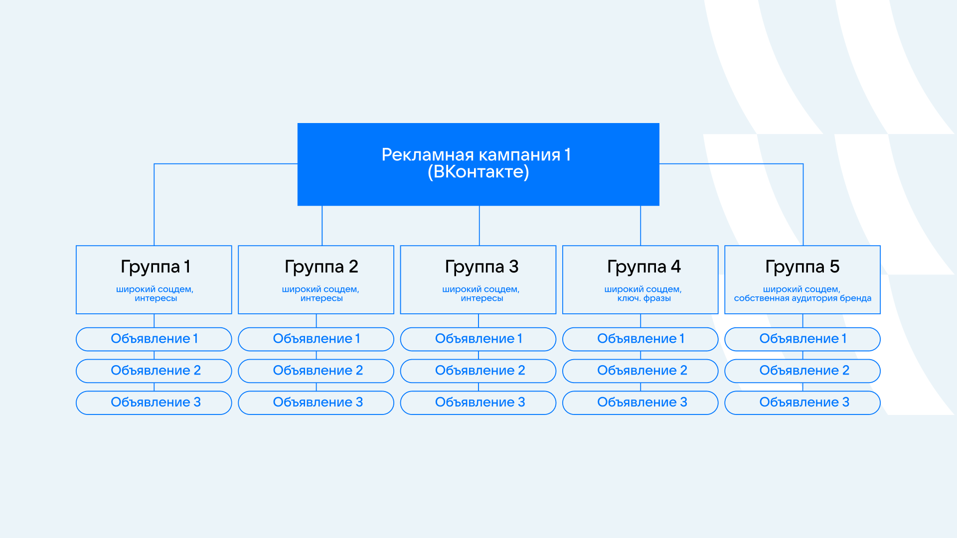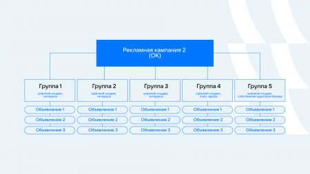 - группа 5: мужчины и дамы 18-55 лет, РФ, доп таргетинг на свою аудиторию бренда.