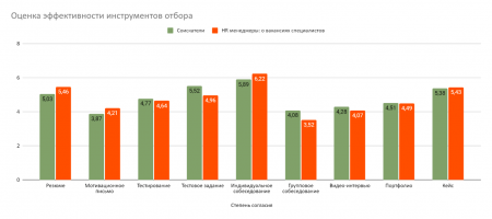 Разговаривая о составе испытаний, соискатели более действенными, чем HR-специалисты, считают Тестирование, Тестовое задание, Групповое собеседование и Видеоинтервью. Другими словами приборы отбора, которые или дозволяют на самом деле показать свои навыки, или условно не затратны по медли. HR-менеджеры более высоко, чем кандидаты, расценивают Резюме, Мотивационное письмо и Собеседование – классические приборы, дающие кандидатам, на наш взор, больше способностей для манипуляций. Ситуация феноминальная: кандидаты желают показать себя в деле, а работодатели предоставляют кандидатам больше способностей «продать себя».
