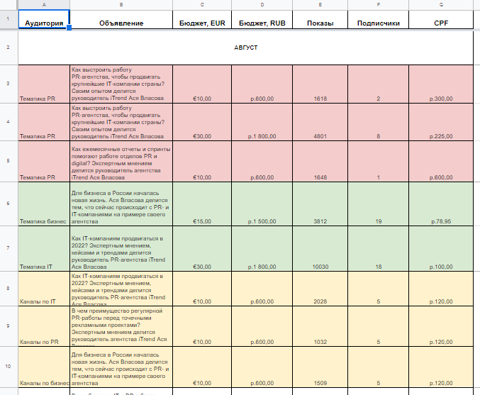 Чтоб собирать и упорядочивать доступные данные и выделять худшие и лучшие объявления, мы решили применять таблицы в Excel. Их опосля каждого теста гипотез наполняет трафик-менеджер.