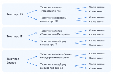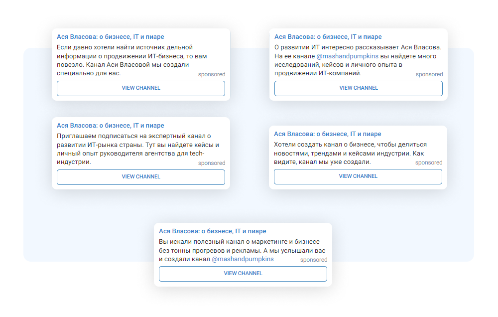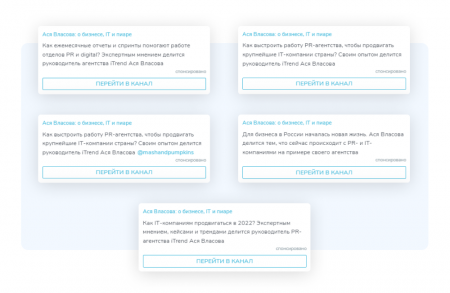 С одной стороны, такое обилие типажей – а означает, и интересов – расширяет способности поиска ЦА. С иной – понижает конверсию, потому что человек, погруженный в тему развития IT-бизнеса, может не кликнуть на объявление, увидев в тексте, что канал еще и про PR и маркетинг.