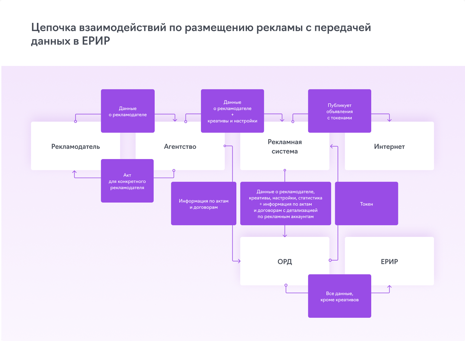 Информация от соучастников базара будет поступать в ЕРИР не напрямую, а через ОРД, операторов маркетинговых данных, с которыми агентствам и маркетинговым системам необходимо будет интегрироваться. ОРД будет выдавать на каждый креатив токен – идентификационный номер для отслеживания, с которым креатив необходимо будет опубликовать.