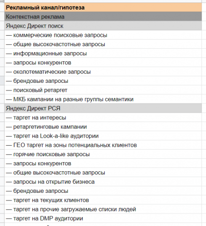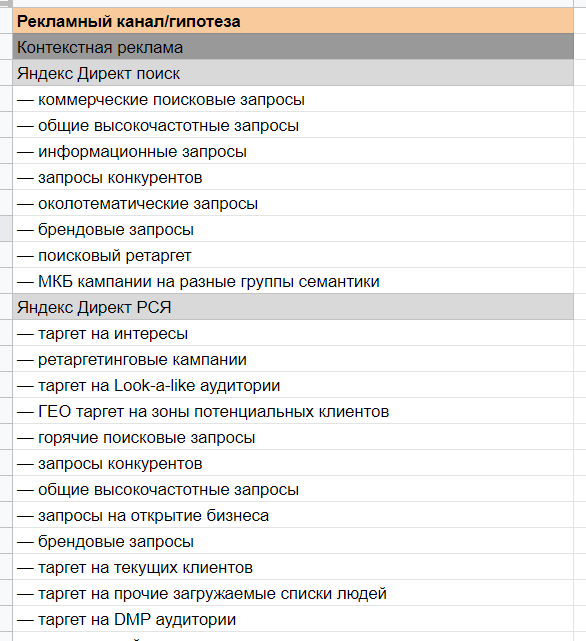 Гипотезы, которые включены в перечень, обхватывают главные из маркетинговых каналов, которые мы используем в рекламе для клиентов. Вышло 64 гипотезы на 9 маркетинговых каналов.